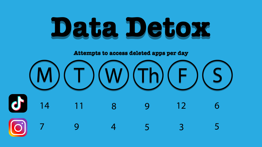Self-reporting data is certainly challenging and comes with a lot of bias. One element that helped me a lot in regard to recording my data for TikTok is that the app is located on the last page of my home screen surrounded by apps that I rarely use. This made it so that every time I went to access the app it became immediately apparent that I tried to do so, and I would record it. For Instagram, however, it was much more challenging because that app is normally located on the home screen that I use the most. This made it so that it wasn’t always in the front of my mind to record the data. Due to this, the number of times I tried to access Instagram according to the data I reported was much lower than TikTok.