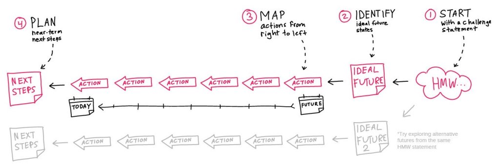 ServiceDesignTools.org defines the process of backcasting as, “an overview of one or more hypothetical future scenarios and works backwards to identify the steps needed to connect that specified futures to the present, represented by a personas, a service or a system.” So how do you do this for your own creative vision?